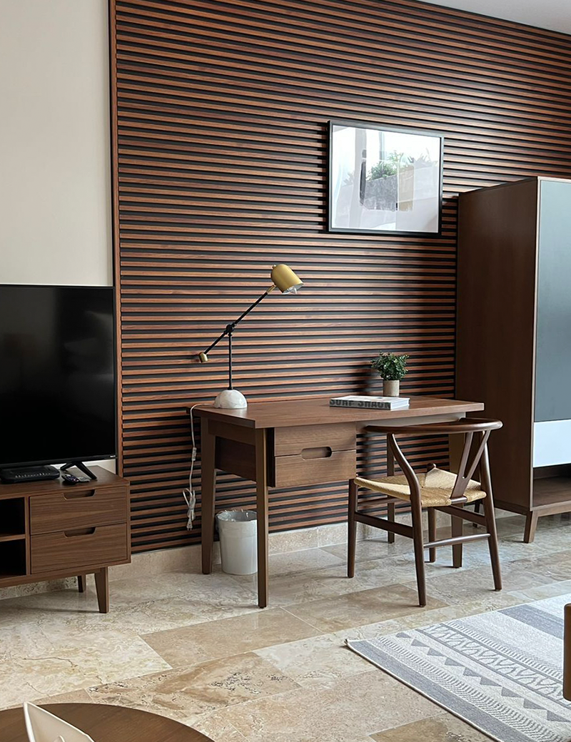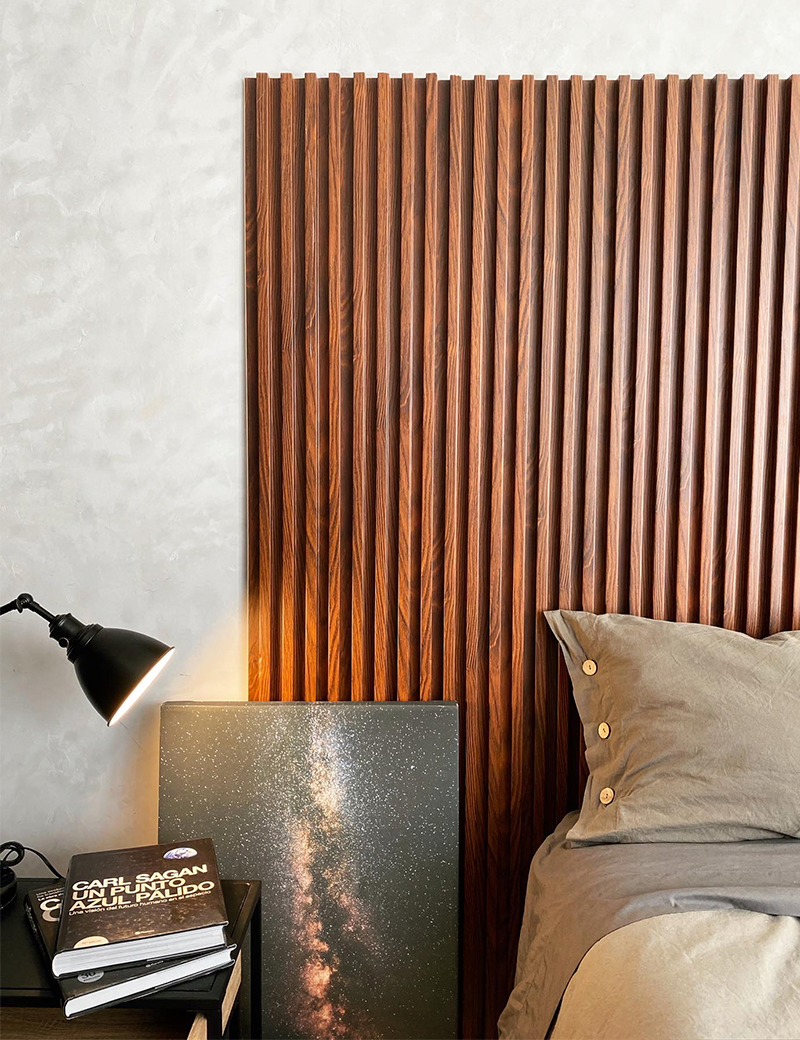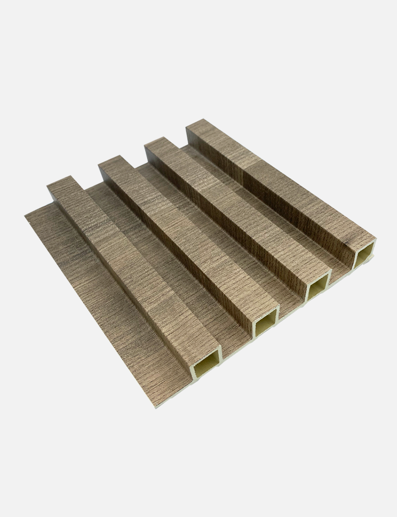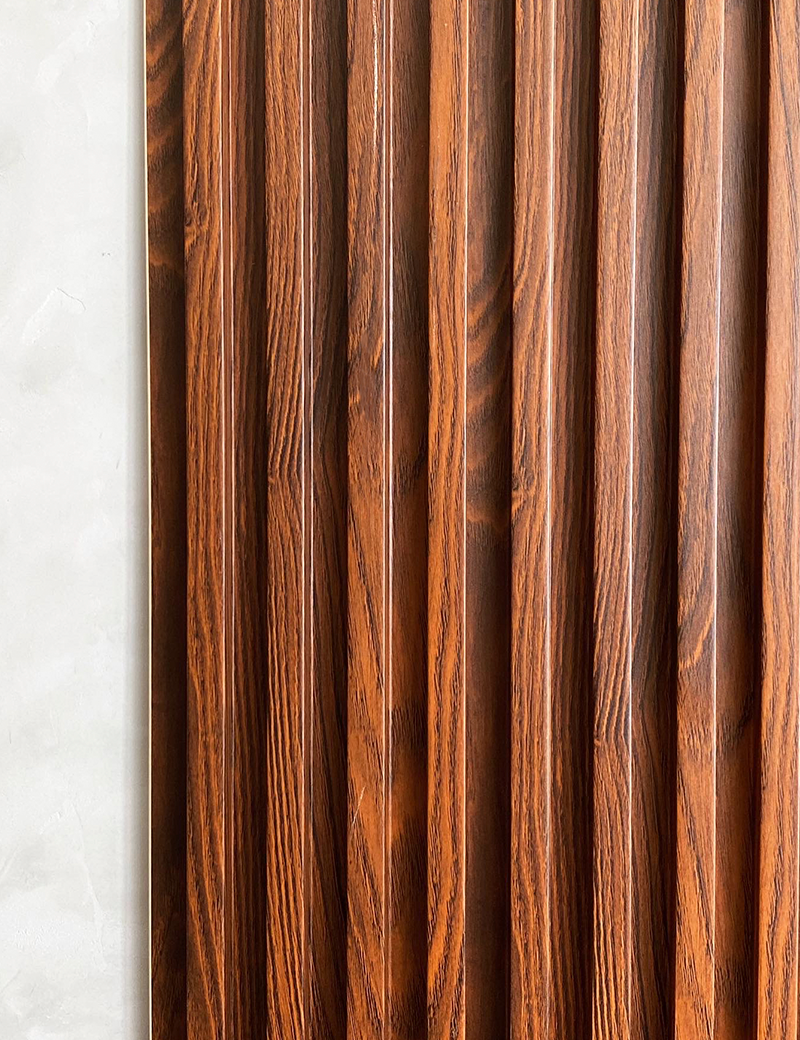 Lambrín de Interior. El panel WPC para interiores está compuesto por un 60% de resina de madera y un 40% de PVC, y está acabado con un revestimiento de alta calidad que ofrece texturas realistas y colores sólidos para adaptarse a cualquier estilo de decoración.