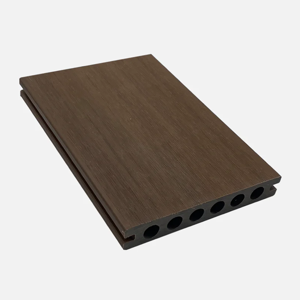 Nuestro deck para exterior en color teca está fabricado mediante tecnología de co-extrusión, que combina una capa protectora con un núcleo compuesto por 60% resina de madera y 40% polímero HDPE de alta densidad.
