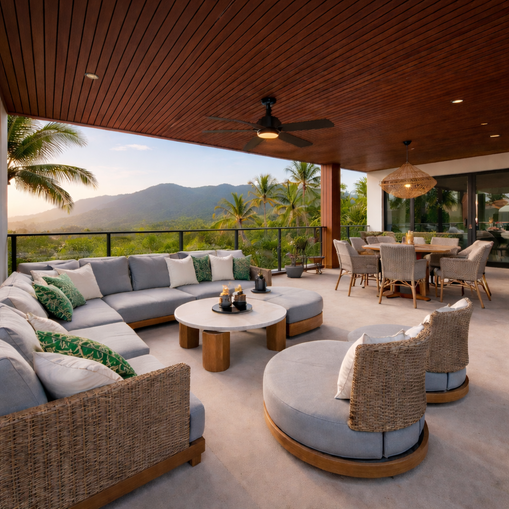 Esta composición lo hace altamente resistente a climas extremos, incluyendo sol intenso, lluvia, nieve y temperaturas elevadas. Ideal para terrazas, jardines, áreas de piscina y otros espacios exteriores.