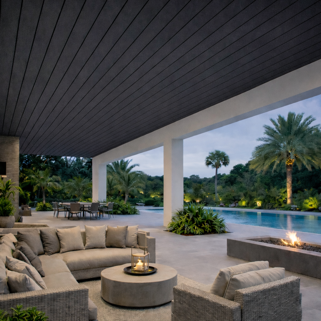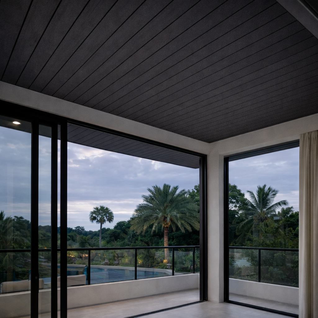 Nuestro plafón M EKS para exterior en color negro, está compuesto por 55% resina de madera, 35% polietileno (PE) y 10% aditivos.