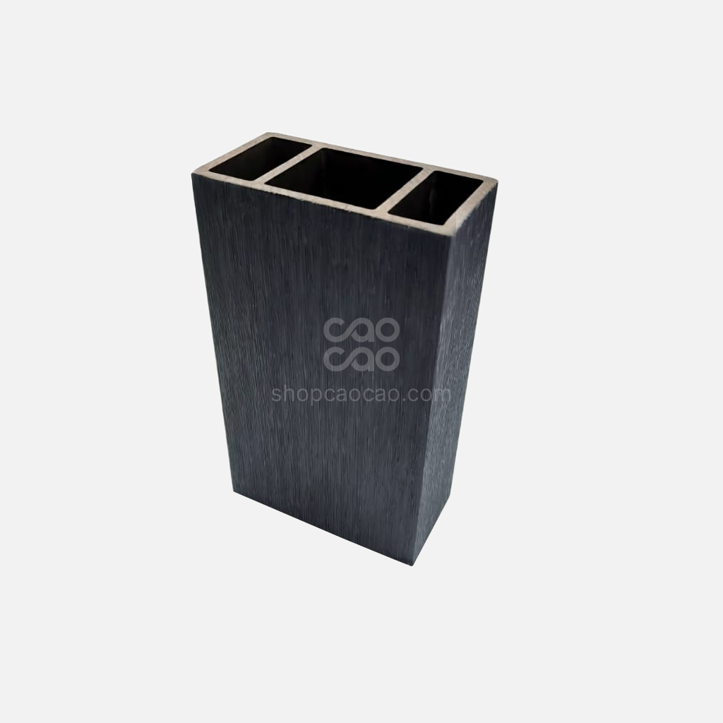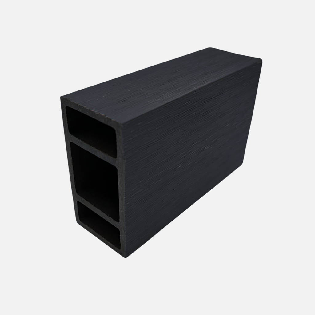 Nuestra viga para exterior en color negro está fabricada mediante tecnología de co-extrusión, que combina una capa protectora con un núcleo compuesto por 60% resina de madera y 40% polímero HDPE de alta densidad.