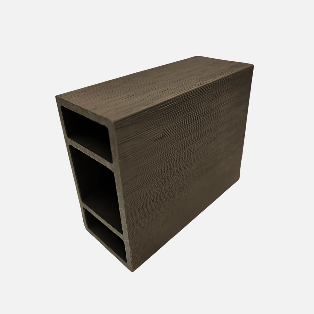 Nuestra viga para exterior en color teca está fabricada mediante tecnología de co-extrusión, que combina una capa protectora con un núcleo compuesto por 60% resina de madera y 40% polímero HDPE de alta densidad.