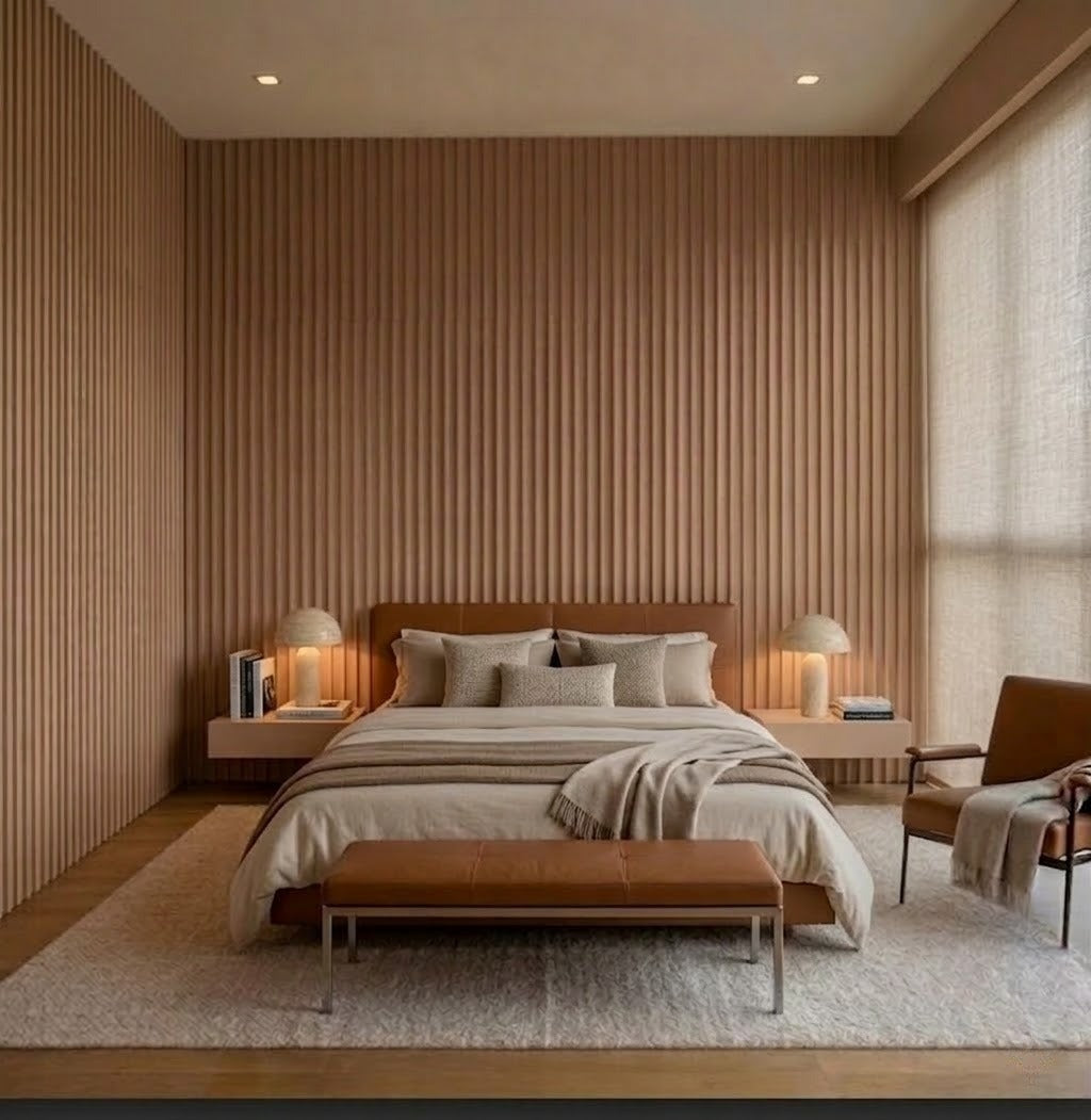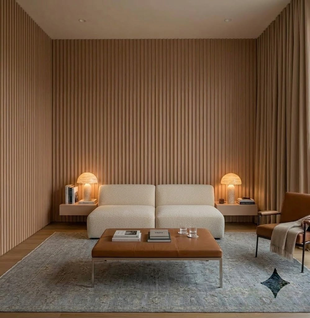 Lambrín de Interior arco chico. El panel WPC para interiores está compuesto por 60% de resina de madera y 40% de PVC, con un revestimiento de alta calidad que ofrece texturas realistas y una apariencia tipo textil, ideal para crear ambientes modernos y elegantes que se adaptan a cualquier estilo de decoración.
