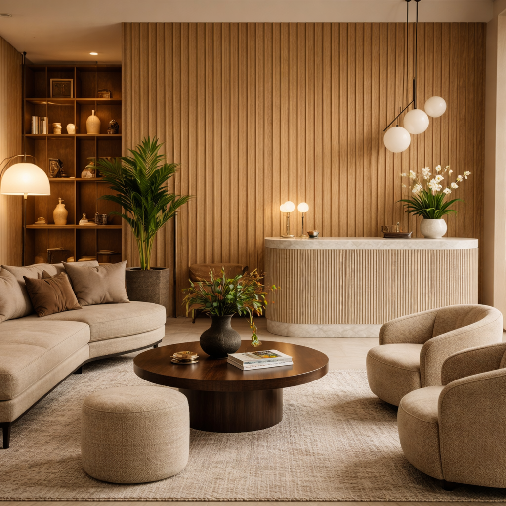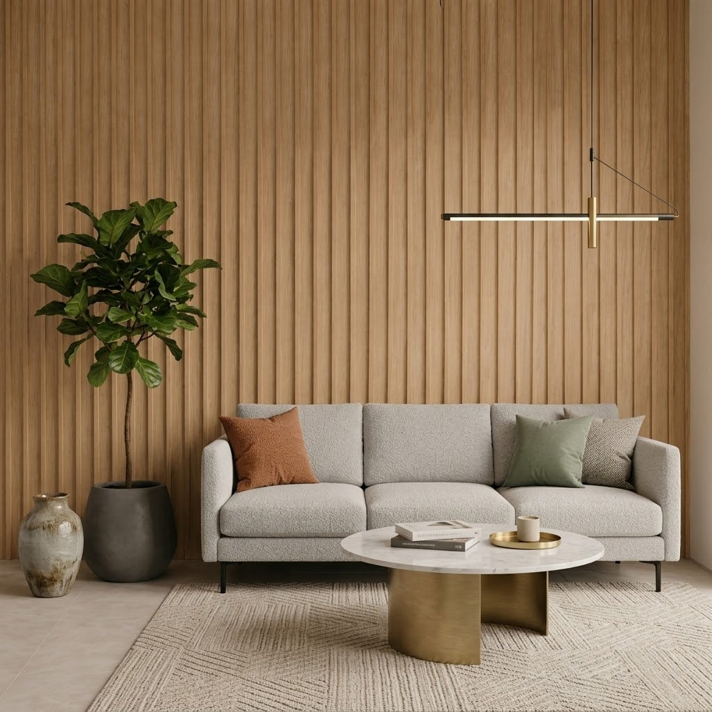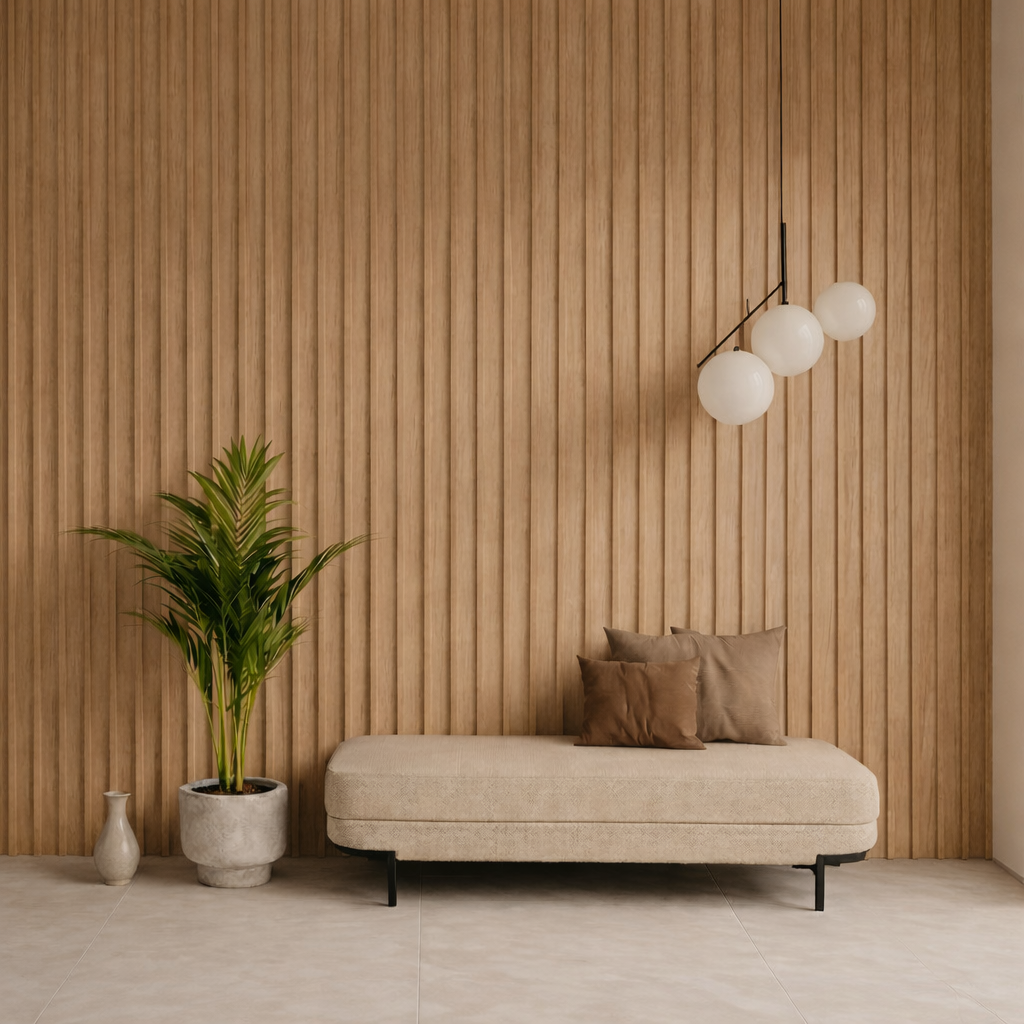 Lambrín de Interior Arco Grande. El panel WPC para interiores está compuesto por 60% de resina de madera y 40% de PVC, con un revestimiento de alta calidad que ofrece texturas realistas, ideal para crear ambientes modernos y elegantes que se adaptan a cualquier estilo de decoración.