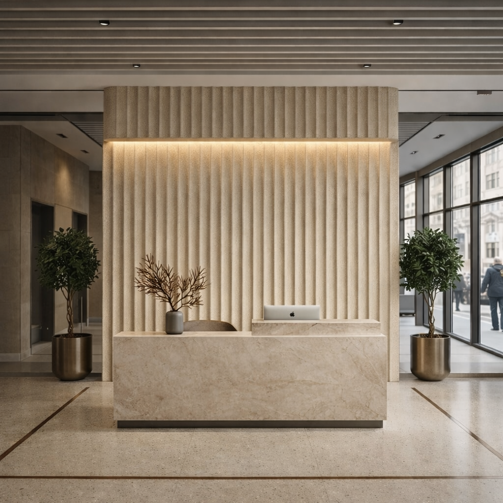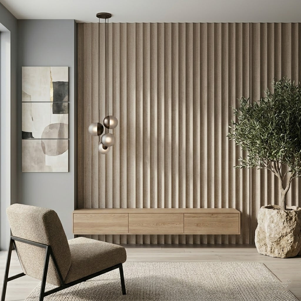 Lambrín de Interior Arco Grande. El panel WPC para interiores está compuesto por 60% de resina de madera y 40% de PVC, con un revestimiento de alta calidad que ofrece texturas realistas y una apariencia tipo textil, ideal para crear ambientes modernos y elegantes que se adaptan a cualquier estilo de decoración.
