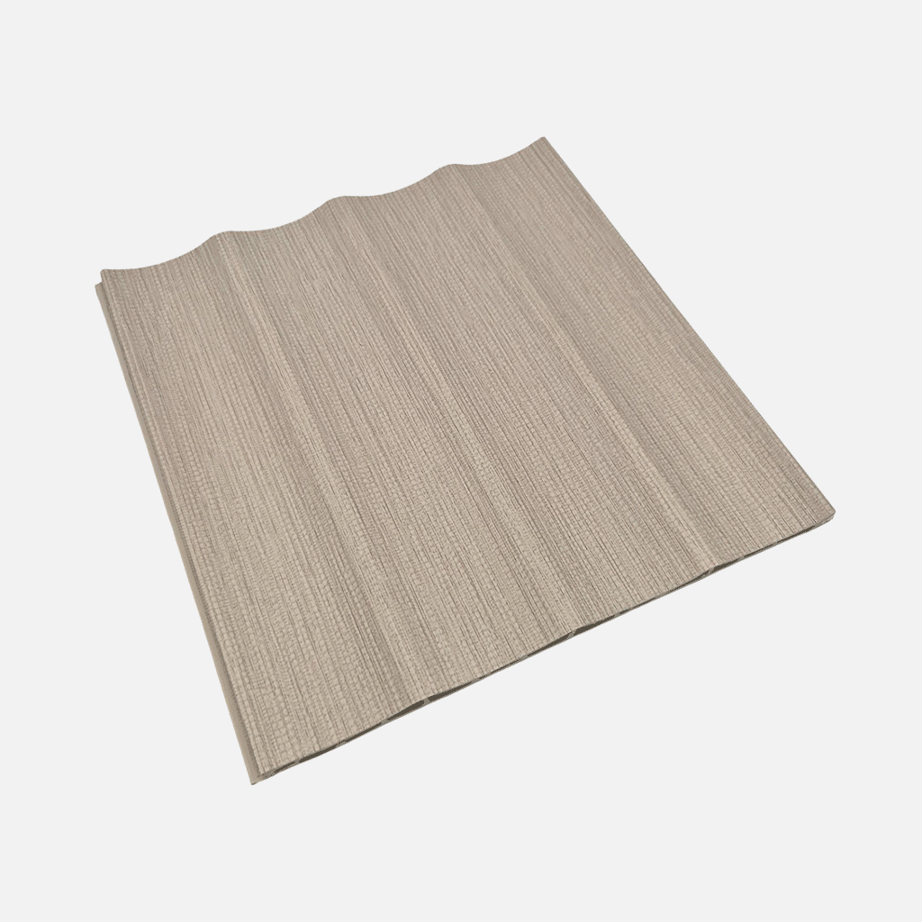 Lambrín de Interior Arco Mediano. El panel WPC para interiores está compuesto por 60% de resina de madera y 40% de PVC, con un revestimiento de alta calidad que ofrece texturas realistas y una apariencia tipo textil, ideal para crear ambientes modernos y elegantes que se adaptan a cualquier estilo de decoración.