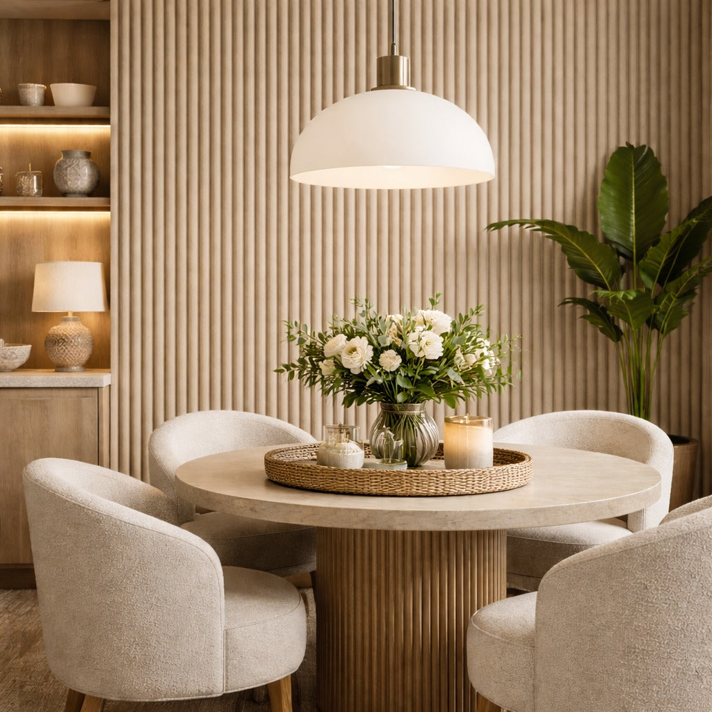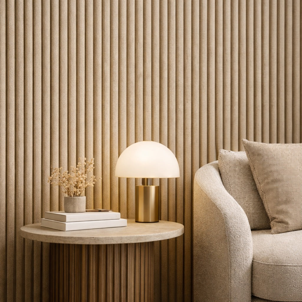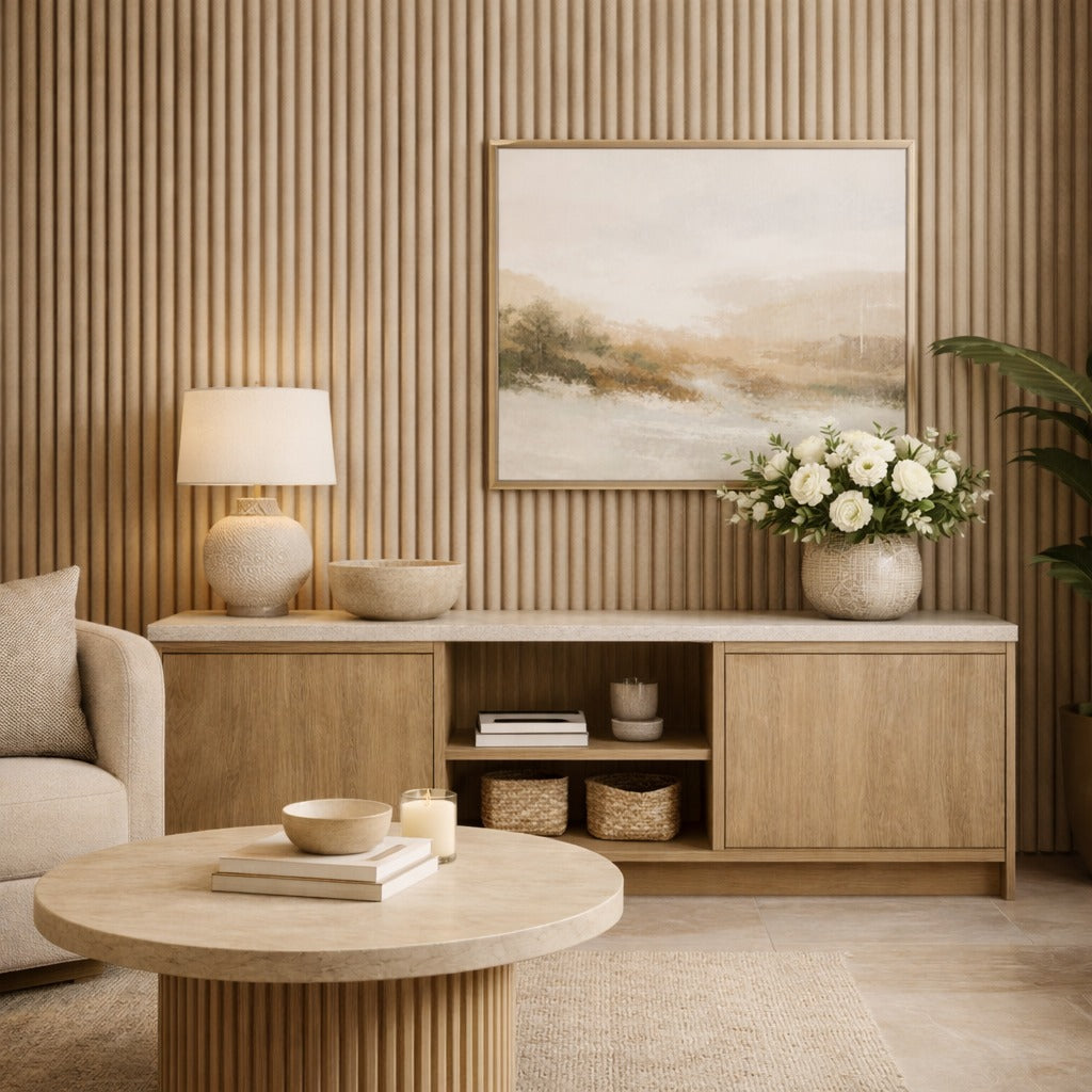 Lambrín de Interior tipo flauta chica color Panama Tramado. El panel WPC para interiores está compuesto por 60% de resina de madera y 40% de PVC, con un revestimiento de alta calidad que ofrece texturas realistas y una apariencia tipo textil, ideal para crear ambientes modernos y elegantes que se adaptan a cualquier estilo de decoración.