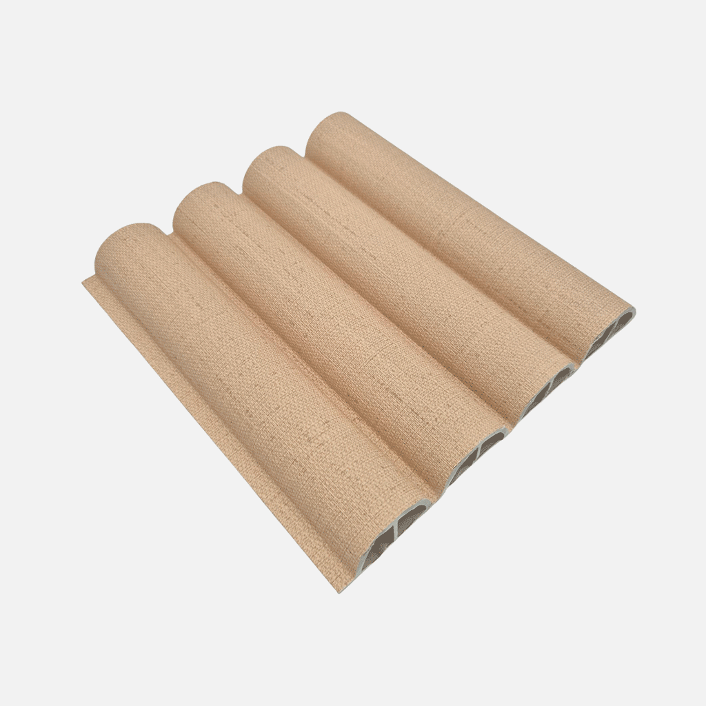 Lambrín de Interior tipo flauta mediana. El panel WPC para interiores está compuesto por 60% de resina de madera y 40% de PVC, con un revestimiento de alta calidad que ofrece texturas realistas y una apariencia tipo textil, ideal para crear ambientes modernos y elegantes que se adaptan a cualquier estilo de decoración.
