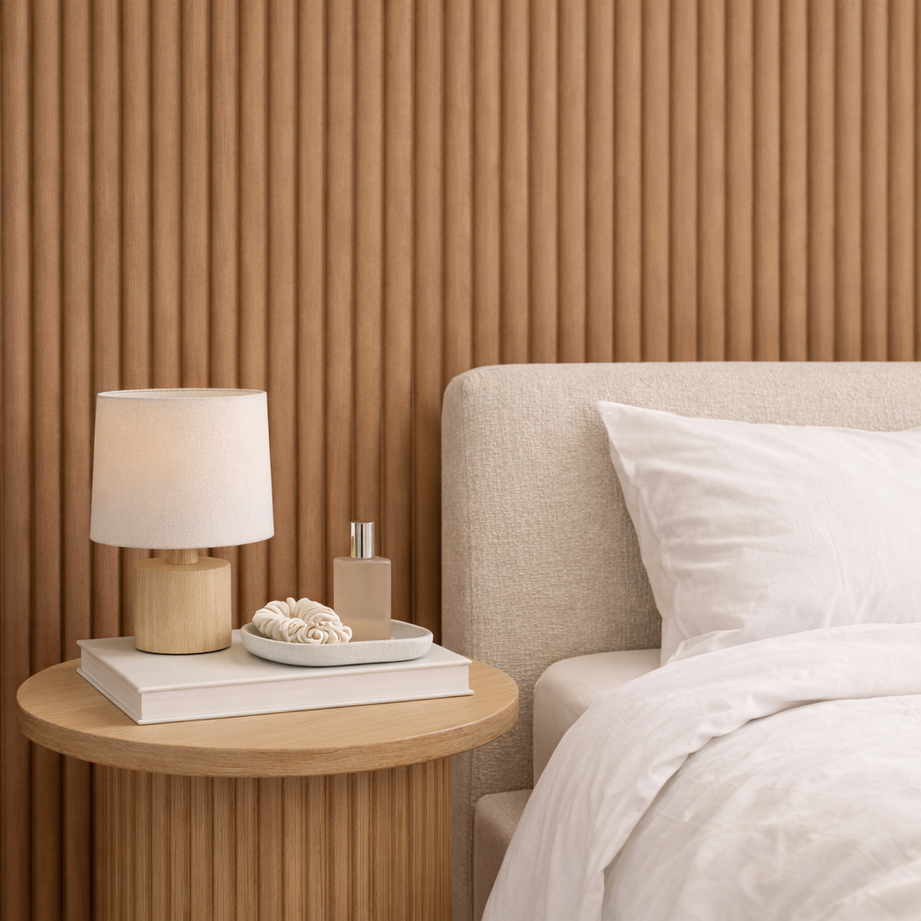 Lambrín de Interior tipo flauta mediana. El panel WPC para interiores está compuesto por 60% de resina de madera y 40% de PVC, con un revestimiento de alta calidad que ofrece texturas realistas y una apariencia tipo textil, ideal para crear ambientes modernos y elegantes que se adaptan a cualquier estilo de decoración.